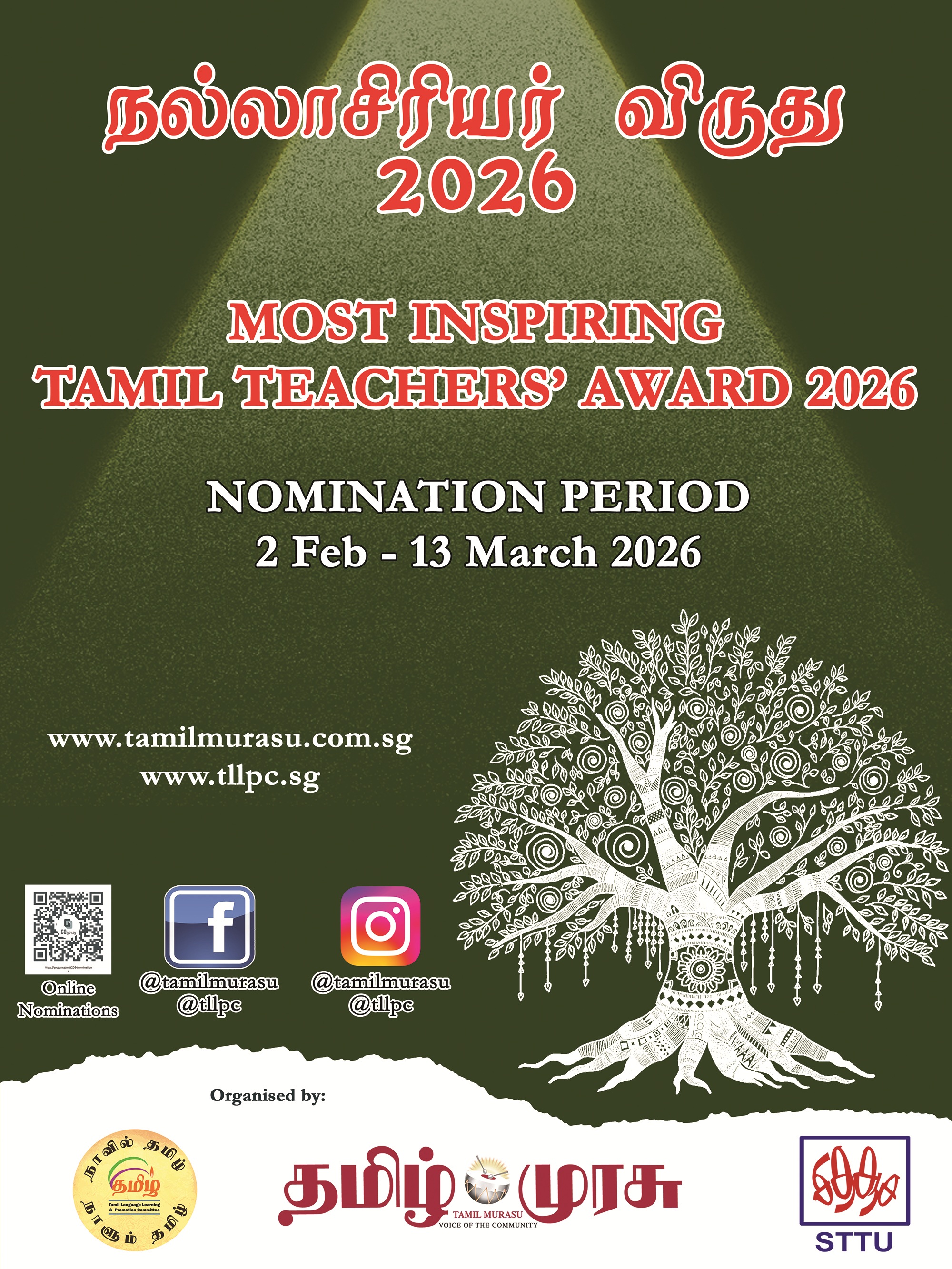 The Most Inspiring Tamil Teachers’ Award 2026 is jointly organised by Tamil Murasu, Singapore Tamil Teachers’ Union and the Tamil Language Learning and Promotion Committee. This award serves to recognise the stellar performance of Tamil teachers in their role in educating and promoting Tamil Language among their students.